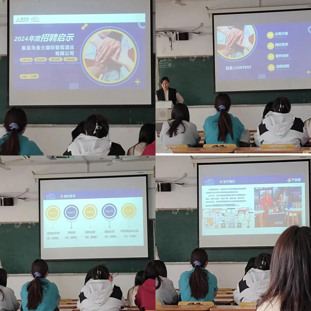 为了帮助大学生了解行业和企业的现状、发展趋势以及所需的职业技能,从而对自己的职业规划有更清晰的认识,了解企业实习和就业机会的重要渠道,通过与企业的直接接触,他们可以了解企业的招聘需求,寻找合适的实习或工作机会秦皇岛金士国际葡萄酒庄有限公司于4月15日上午十点在1B107教室举办了企业宣讲会。