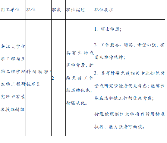 本单位拟公开招聘员工2名,派遣至浙江大学化学工程与生物工程学院生物工程研究所申有青教授课题组,具有生物或医学背景肿瘤免疫工作经历者优先,待遇从优。招聘将坚持公开、公平、竞争、择优的原则,凡符合招聘岗位要求且有意向者,请提供个人中文简历(包括学习、工作经历)以及其它证明本人技能、水平的相关资料,将材料同时发送:piaoying@zju.edu.cn,主题请注明“岗位应聘”。经考核后择优录取、待遇面议,具体招聘岗位及要求详见附件。