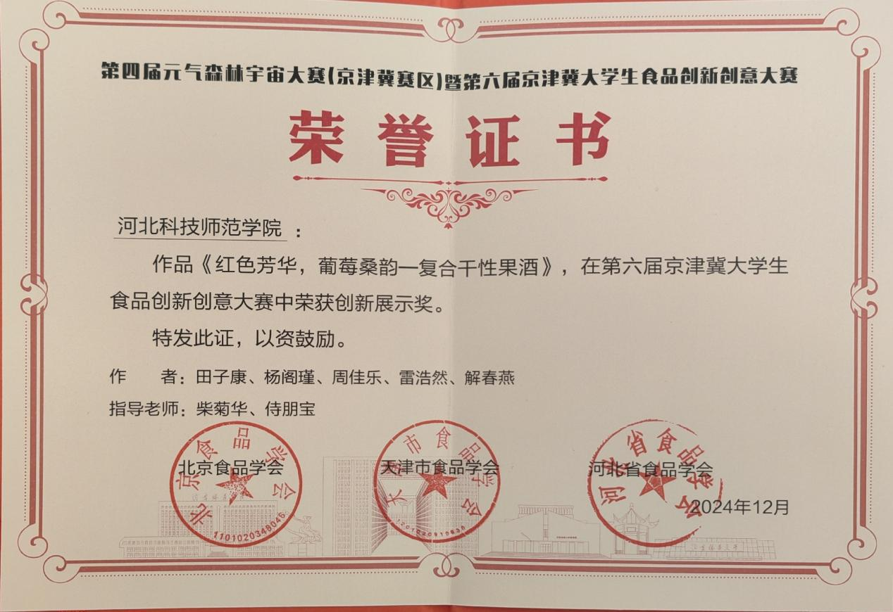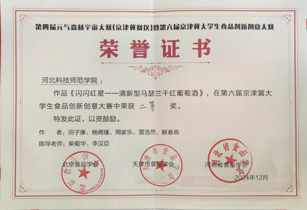 2024 年 12 月 8 日,河北昌黎葡萄科技小院柴菊华教授领衔指导的大学生自主创新项目“闪闪红星—清新型马瑟兰干红葡萄酒”和“红色芳华葡莓桑韵——复合干型果酒”,在第四届元气森林宇宙大赛暨第六届京津冀大学生食品创新创意大赛上,分别获得二等奖和创新展示奖的好成绩。