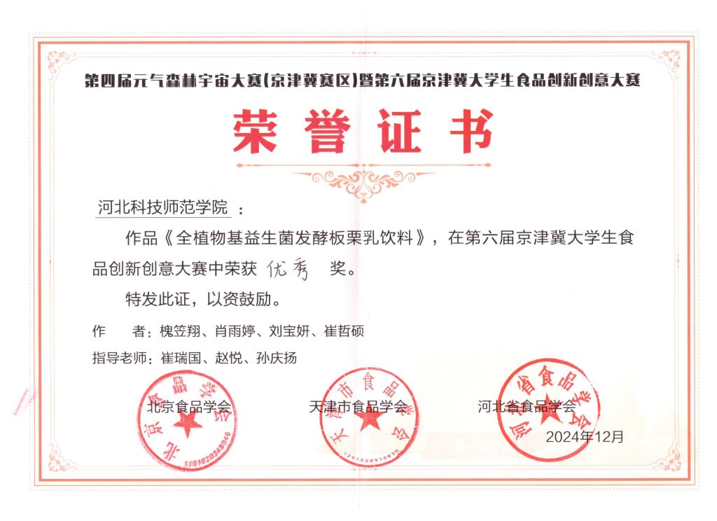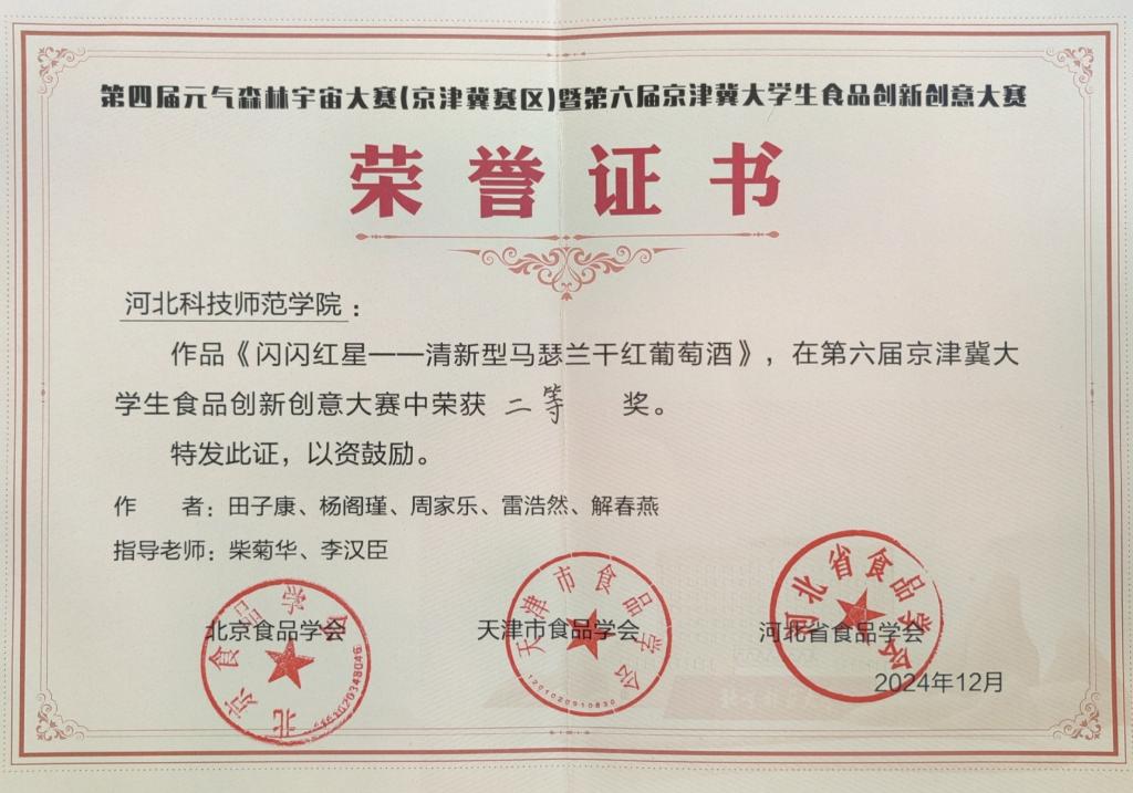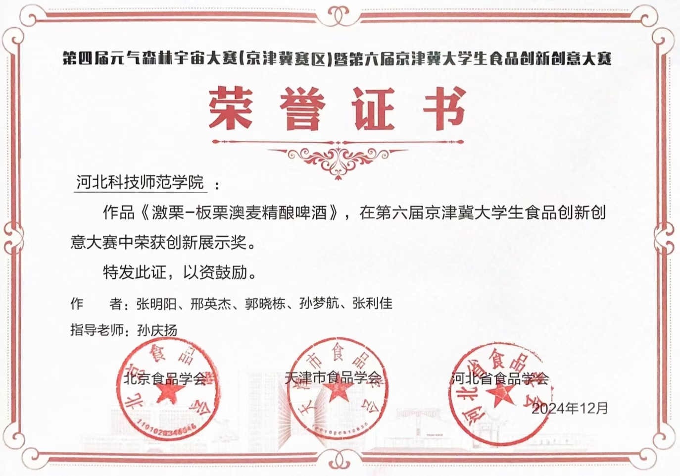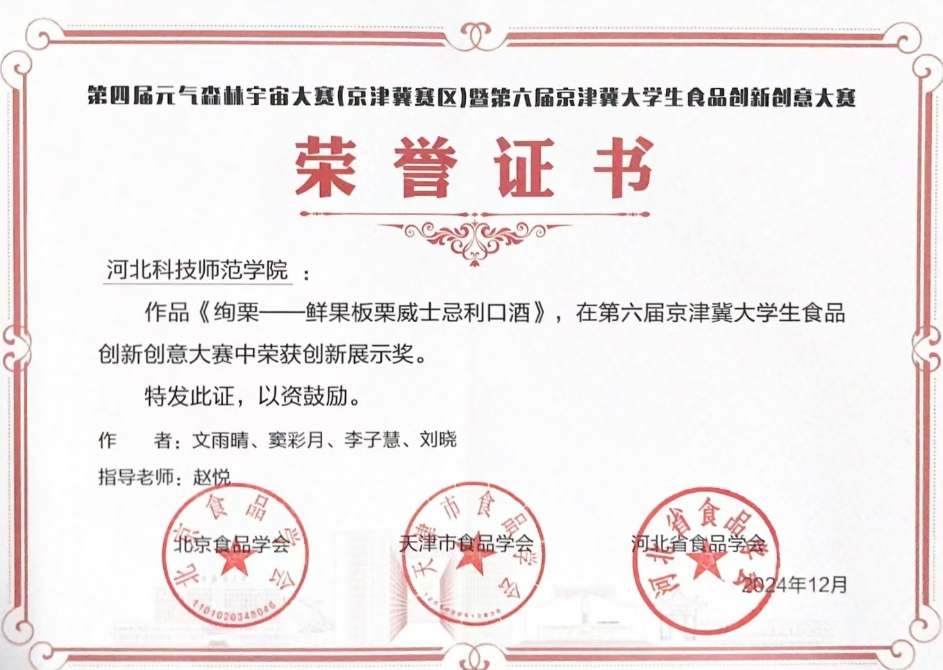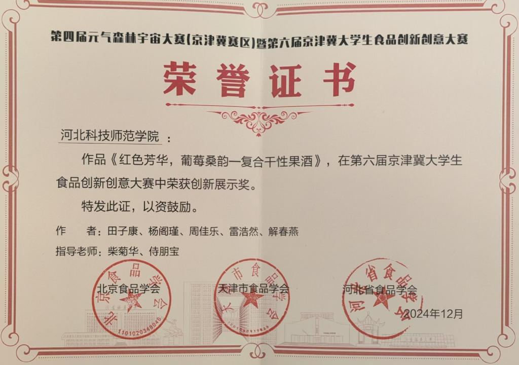 2024年12月8日,由北京食品学会、天津市食品学会及河北省食品学会联合主办,北京林业大学等单位承办的第四届元气森林宇宙大赛(京津冀赛区)暨第六届京津冀大学生食品创新创意大赛圆满落幕。yL23411永利集团暨葡萄酒学院积极组织学生团队参加,4个参赛团队脱颖而出,喜获5个奖项。