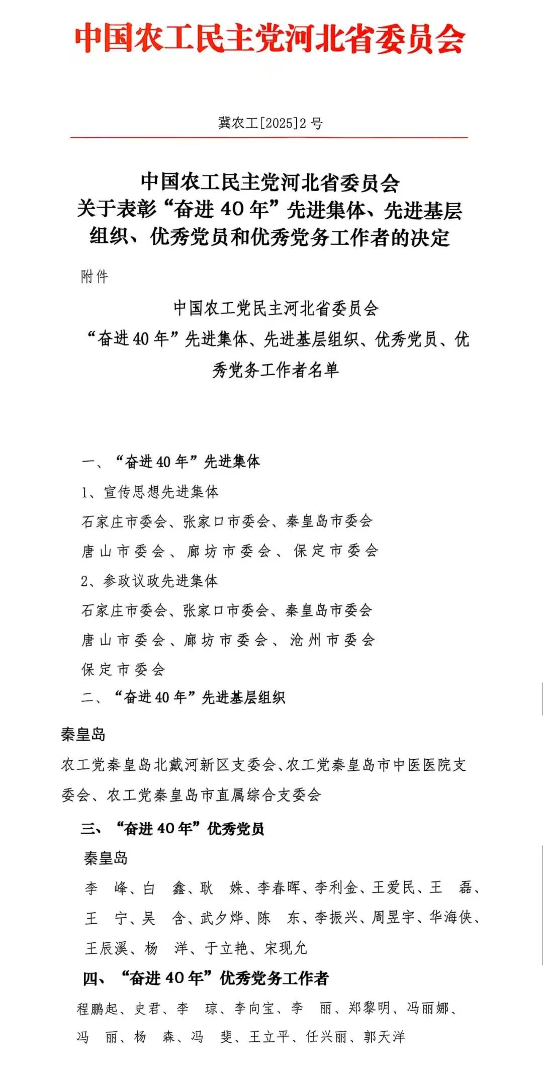 近日,农工党河北省委印发《关于表彰“奋进40年”先进集体、先进基层组织、优秀党员和优秀党务工作者的决定》(冀农工〔2025〕2号),推选出26个先进集体,40个先进基层组织,229名优秀党员,18名优秀党务工作者。