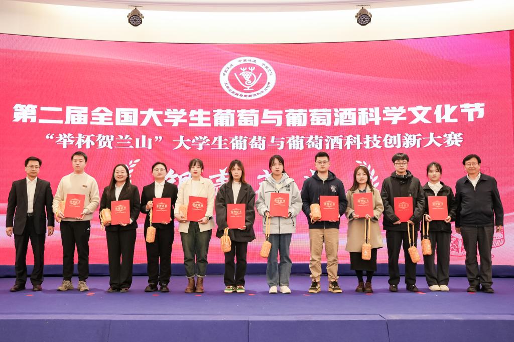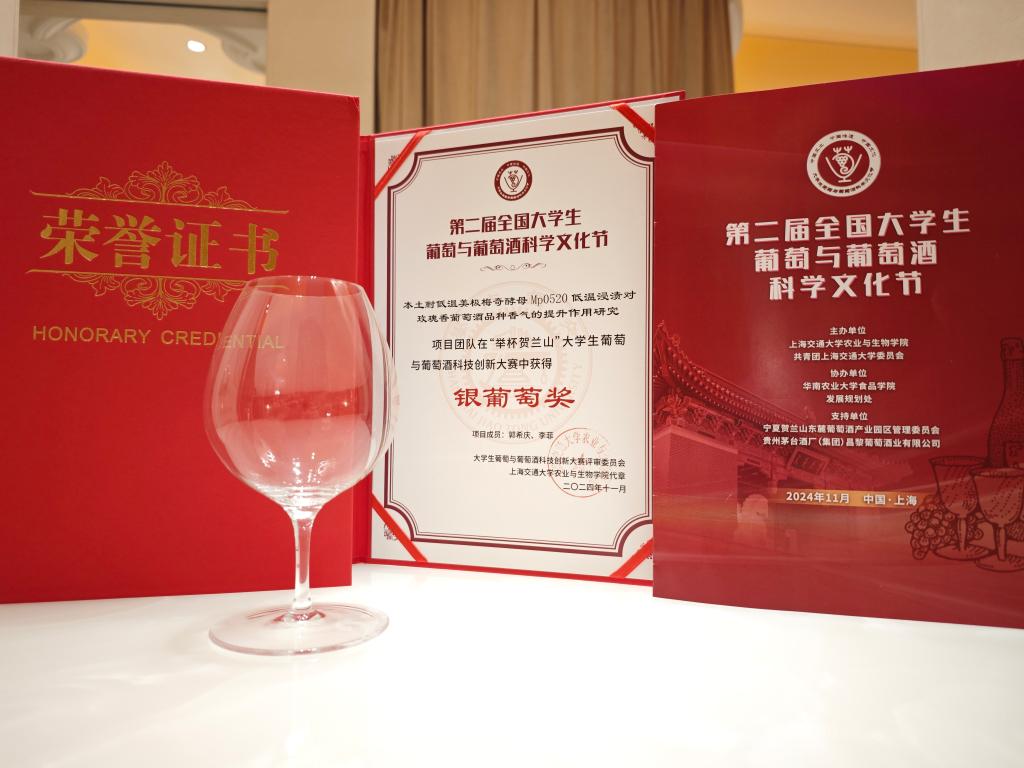 为了激发大学生内在的创新动力和实践才能,积极引导他们参与中国本土葡萄产业的升级和葡萄酒品质提升的高质量发展进程,11月24日,第二届全国大学生葡萄与葡萄酒科学文化节在上海交通大学闵行校区隆重举办。学院阎贺静老师指导的研究生郭希庆、李菲的项目团队在“举杯贺兰山”大学生葡萄与葡萄酒科技创新大赛中荣获“银葡萄奖”。