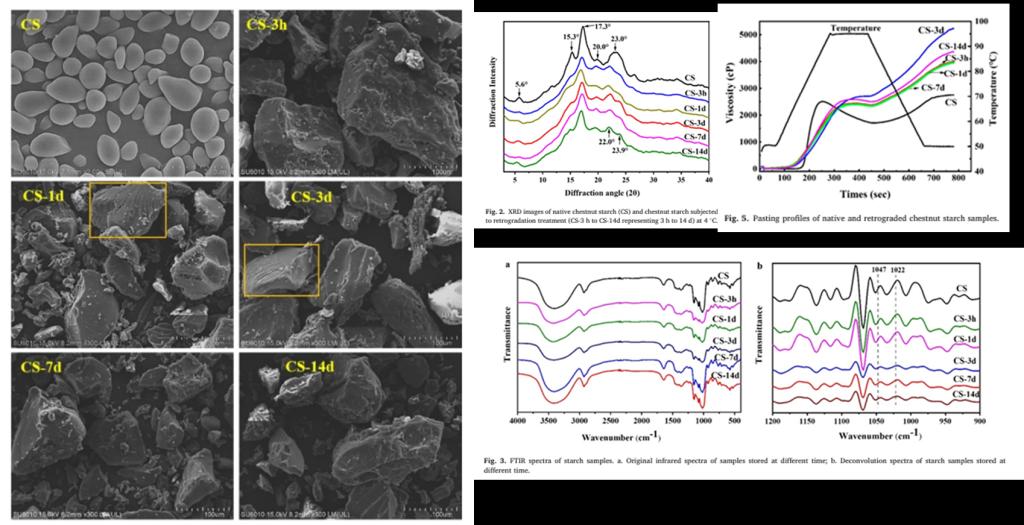 使用 X 射线衍射 XRD)、傅里叶变换红外 FTIR 光谱和固态13C 核磁共振 NMR)研究了储存时间对糊化板栗淀粉结构特性和体外消化率的影响,研究发现逆行板栗淀粉的长程结晶度和短程分子顺序在 3 h 3 d 先迅速增加,然后从 3 d 7 d 下降,随后随着回生从 7 d 14 d 略有增加。随着 4 贮藏时间的延长,单螺旋和双螺旋结构普遍明显增加,堆积成长期有序结构,导致差示扫描量热光谱 DSC 检测到的焓变增加,逆行板栗淀粉消化速率降低。总的来说,这项研究可能为加工和提高板栗食品的质量提供重要意义。