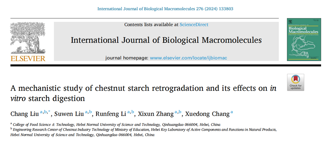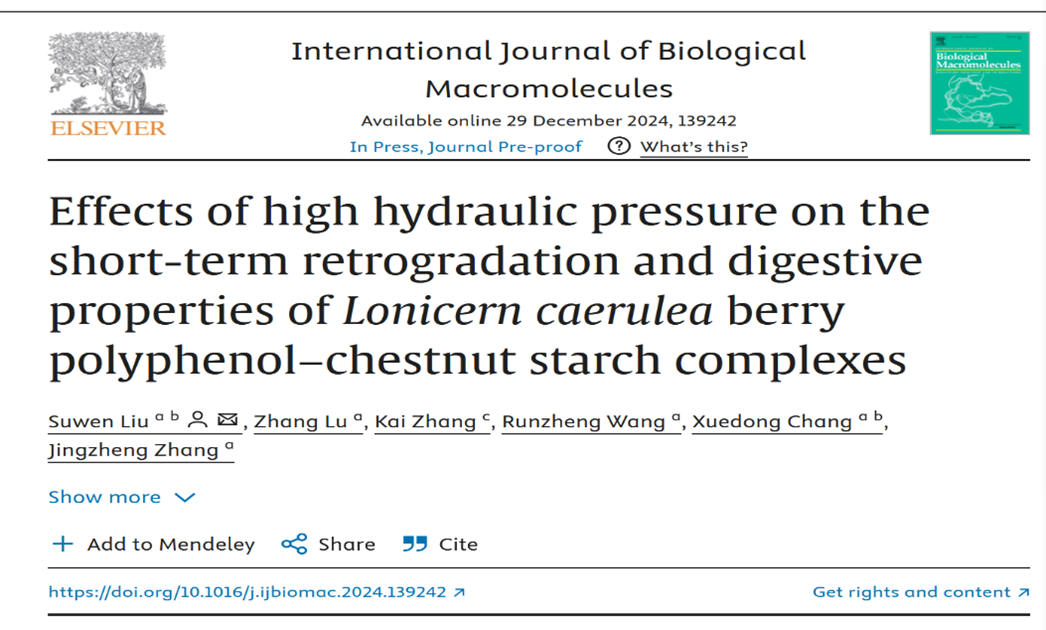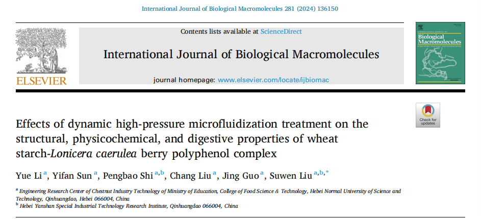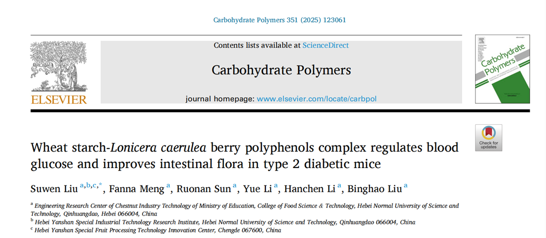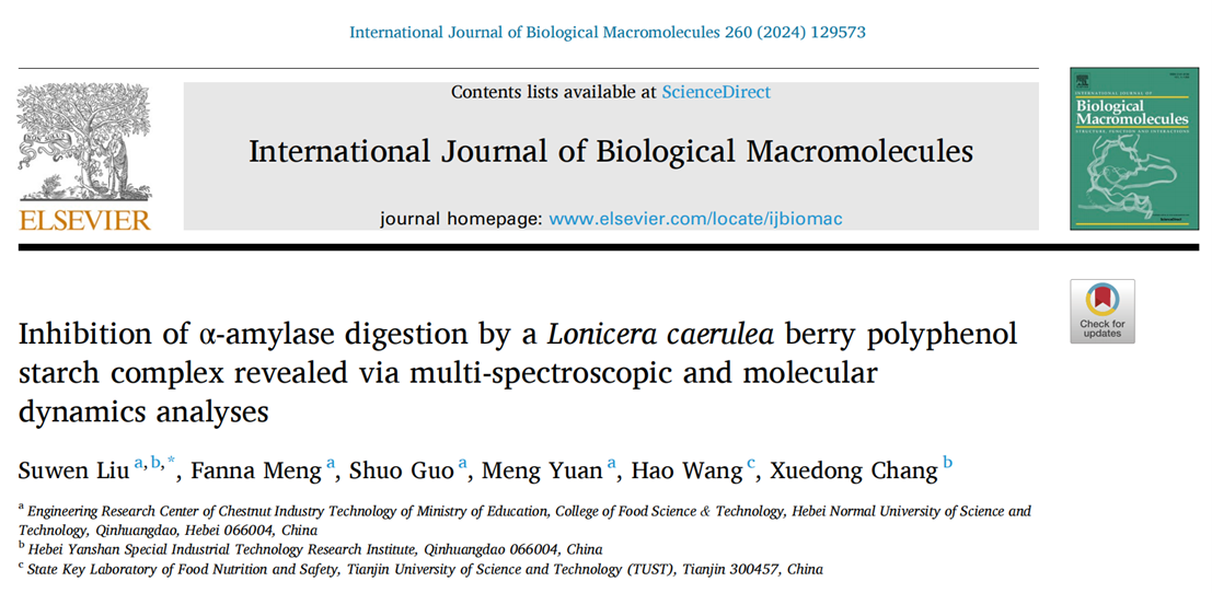 近日,我院刘素稳教授课题组在淀粉及其与多酚的复合物制备及其功能特性研究取得系列进展。在中科院1Top期刊《Carbohydrate Polymers》《International Journal of Biological Macromolecules》分别发表了题为“Wheat starch-Lonicera caerulea berry polyphenols complex regulates blood glucose and improves intestinal flora in type 2 diabetic mice”“Inhibition of α-amylase digestion by a Lonicera caerulea berry polyphenol starch complex revealed via multi-spectroscopic and molecular dynamics analyses”“Effects of dynamic high-pressure microfluidization treatment on the structural, physicochemical, and digestive properties of wheat starch-Lonicera caerulea berry polyphenol complex”“A mechanistic study of chestnut starch retrogradation and its effects on in vitro starch digestionEffects of high hydraulic pressure on the short-term retrogradation and digestiveproperties of Lonicern caerulea berrypolyphenol-chestnut starch complexes”五篇论文,刘素稳教授和刘畅副教授分别为通讯作者,刘素稳、刘畅、22级食品科学硕士研究生分别为一作。该成果得到国家自然科学基金青年基金(32101952)、河北省自然科学基金杰出青年科学基金(C2024407033)、河北省自然科学基金面上项目(C2023407040),和板栗产业技术教育部工程研究中心的资助。