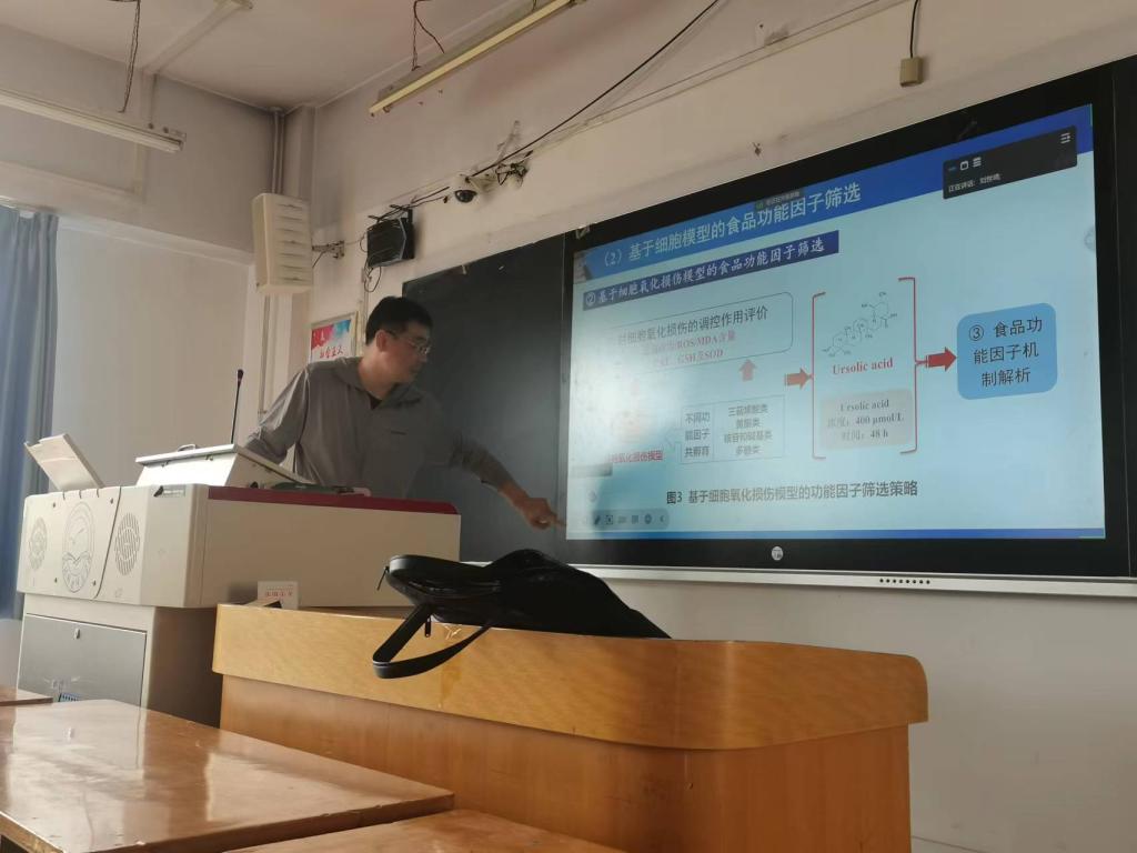 宋丽军副教授首先以特色农产品红枣的功能因子筛选为切入点,讲解了不同红枣中三萜烯酸含量、碱基、核酸和环核苷酸类含量的分析、扩展应用及其领域突破。他从细胞模型的食品功能因子筛选及其动物模型的食品功能因子机制做了总体的概括和介绍。对于农产品创新加工方面有很大的正向推动,例如红花籽油、口红、润唇膏、红枣蒸馏酒都成功投入生产并深受消费者喜爱。此外,宋丽军副教授还感悟到了在研究和教学指导过程中,“学生品行端正”、“学生为人正直,格局高远”的重要性,最后,宋丽军老师还同现场和线上的师生展开了热烈的交流讨论。(编辑:姚红,审核:杨崇泽)